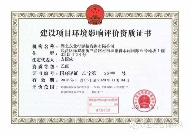 近期,永业行环境影响评价资质(乙级)顺利通过环保部资质延续审查,资质延续申请获中国环境保护部批准。环境影响评价资质(乙级)延续批准评价范围为一般项目环境影响报告表和采掘、社会服务、交通运输类环境影响报告书(乙级)。资质有效期自2016年11月5日至2020年11月4日。
