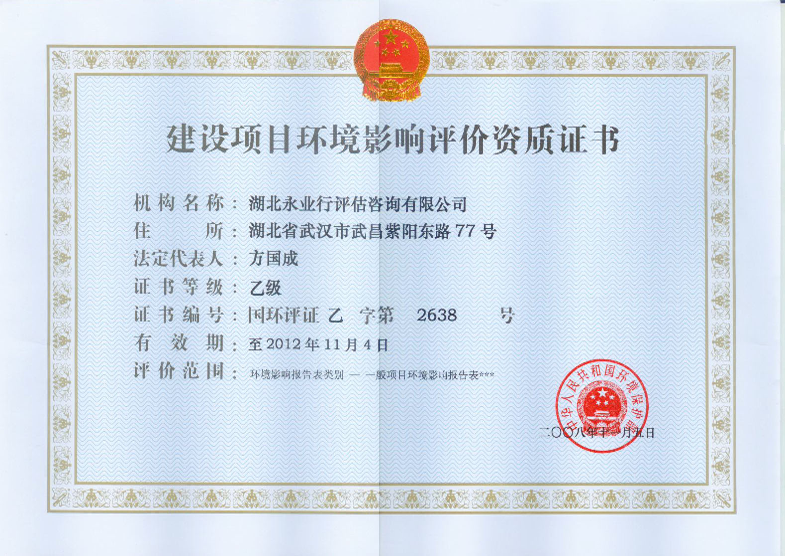 近日,永业行取得了由环境保护部颁发的乙级建设项目环境影响评价资质证,证书编号为国环评证乙字第2638号。自此,永业行可独立为客户提供建设项目环境影响评价业务服务。在此之前,永业行曾与其他机构合作完成多项环境影响评价项目。