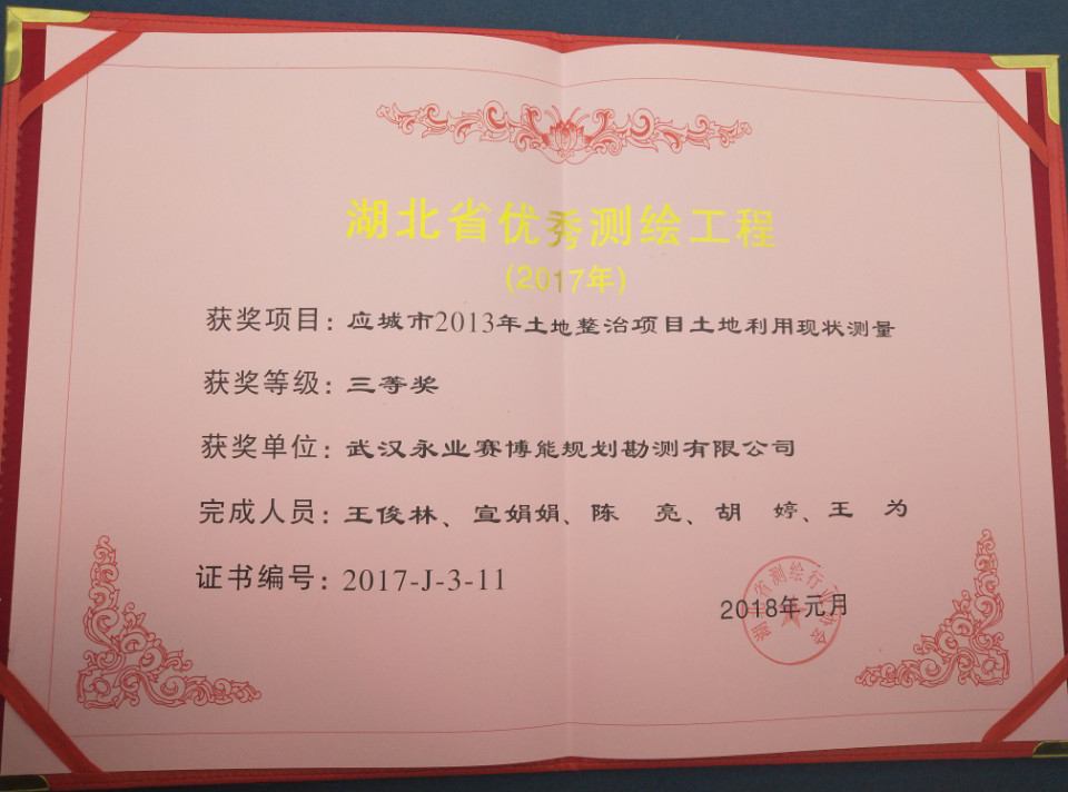 2018年3月16日,由湖北省测绘行业协会主办的“第三次全国土地调查技术论坛”在汉召开,武汉永业赛博能规划勘测有限公司应邀参会,申报的课题“应城市2013年土地整治项目土地利用现状测量"获评“2017年度湖北省优秀测绘工程奖”三等奖。