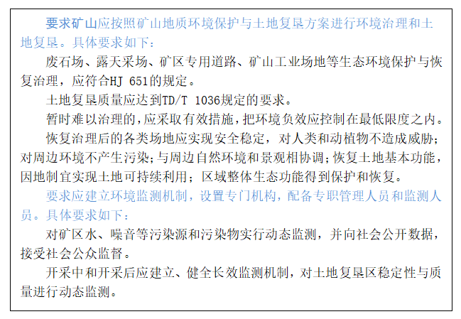 这条规定针对的是矿山地质环境治理与复垦,以及在环境监测方面的要求,本文仅针对以上两方面展开论述。
