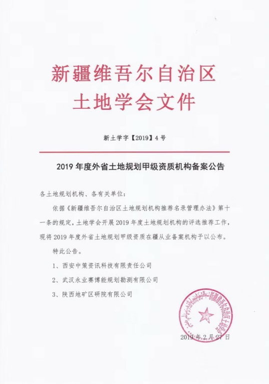 近日,新疆维吾尔自治区土地学会发布了2019年度外省土地规划甲级资质机构备案名录,永业行集团旗下武汉永业赛博能规划勘测有限公司入围该名录,取得在新疆维吾尔自治区开展土地规划业务的资格。