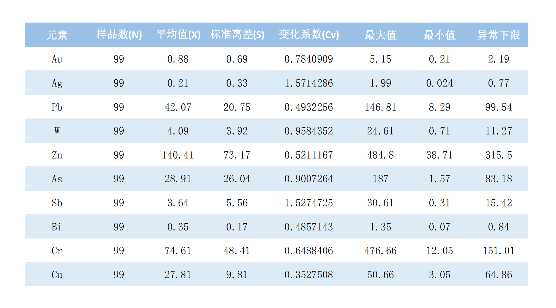 表1 沱沱河地区1号线地化剖面元素异常参数统计表