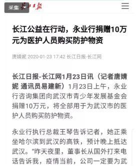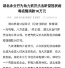 “为众人抱薪者,不可使其冻毙于风雪。抗击肺炎、守护医护人员安全是我们义不容辞的责任。为了让一线医护人员有更加充足、更加安全的保障,永业行党委、工会、职代会、青年联合会共同倡议募捐,希望大家精诚团结、奉献爱心、共战疫情,共同守护我们的家园!”2月1日,一封募捐倡议在永业行工作群内发布。潘世炳带头捐款,全体党员和各地员工也迅速响应,不到48小时,收到约700名员工共计20余万元捐款。截至2月17日,永业行及千余名员工累计筹得善款近40万元,陆续汇入武昌区慈善总会等慈善机构,期望通过点滴爱心,为战胜疫情尽永业行绵薄之力。