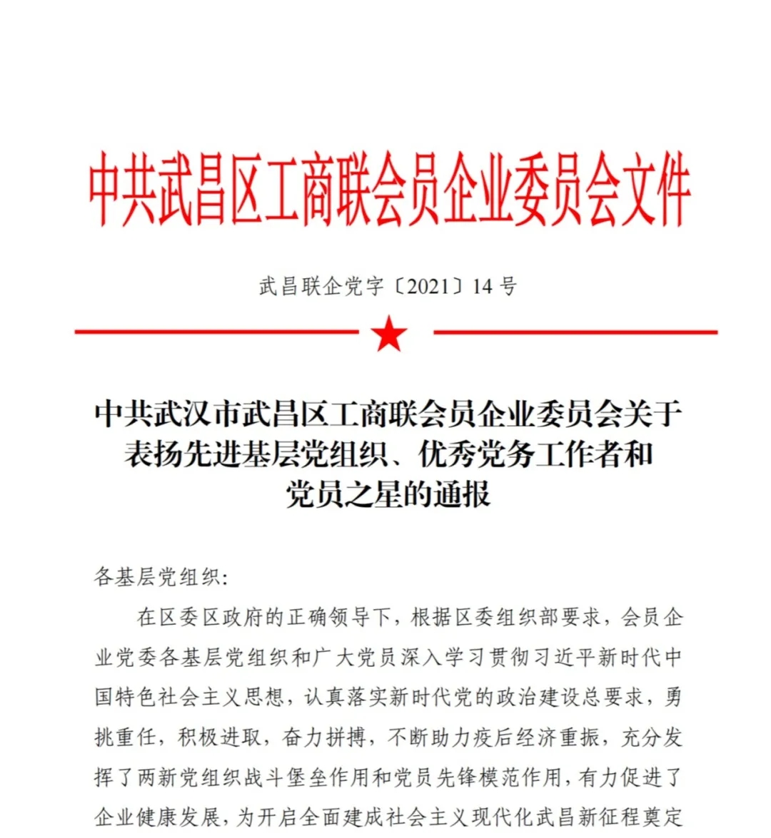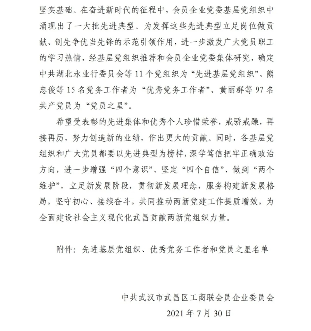在庆祝党的百年华诞之际,7月30日,中共武汉市武昌区工商联会员企业委员会发文(武昌联企党字〔2021〕14 号),对会员企业先进基层党组织、优秀党务工作者和党员之星进行表彰,永业行党委获评“先进基层党组织”,周小川等20名党员获评“党员之星”