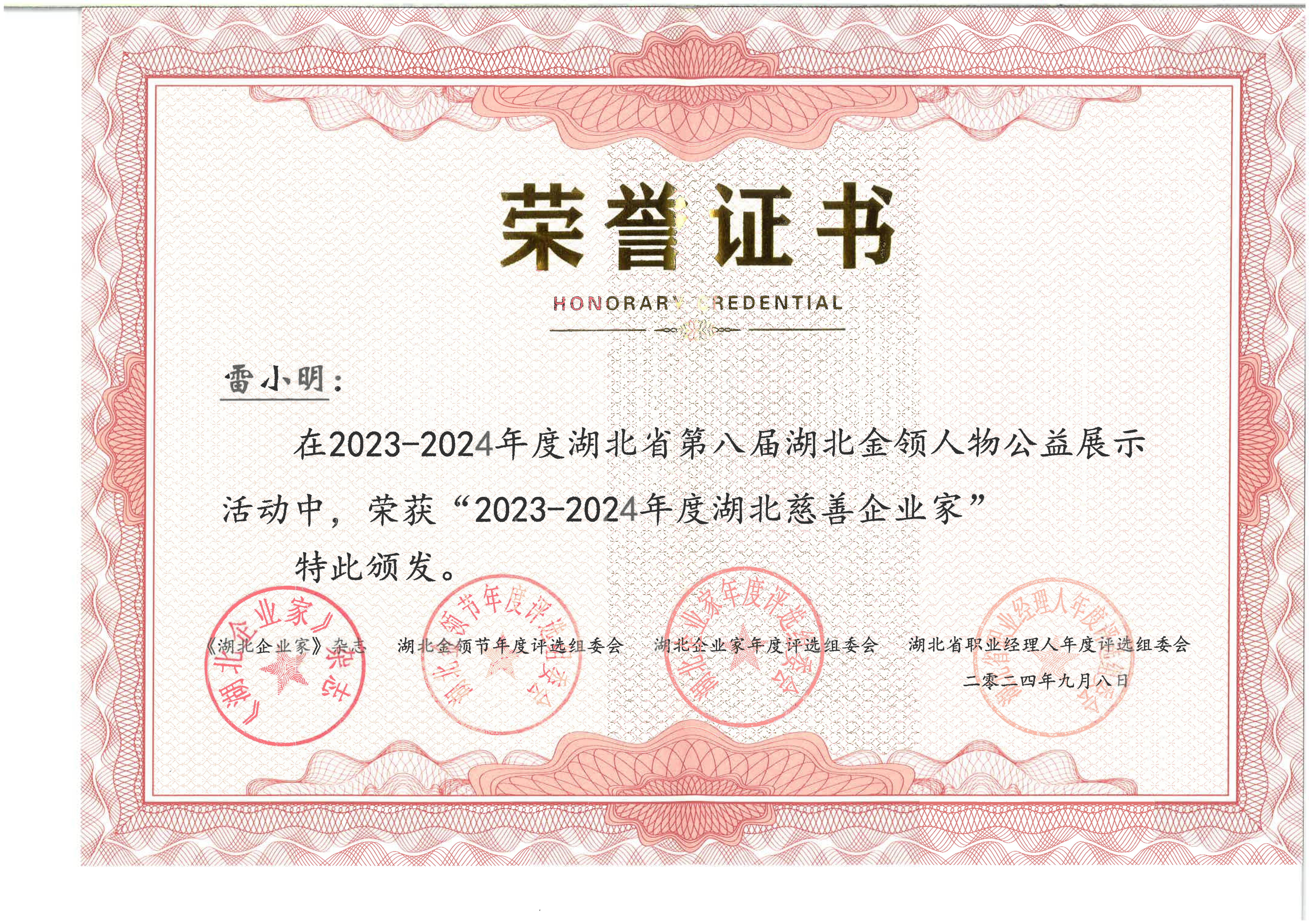 雷小明荣获“2023-2024年度湖北慈善企业家”