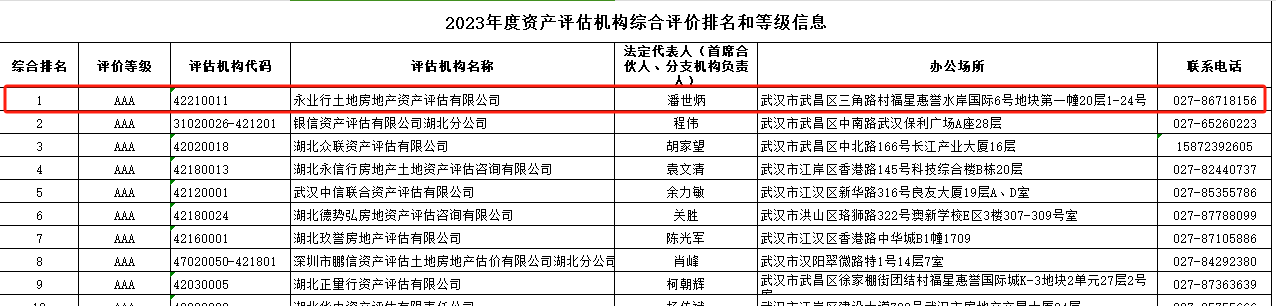 2024年9月9日,湖北省资产评估协会发布2023年度湖北省资产评估机构综合评价榜单,永业行凭借卓越的服务质量和执业水平,荣膺“AAA级资产评估机构”,位列湖北第一