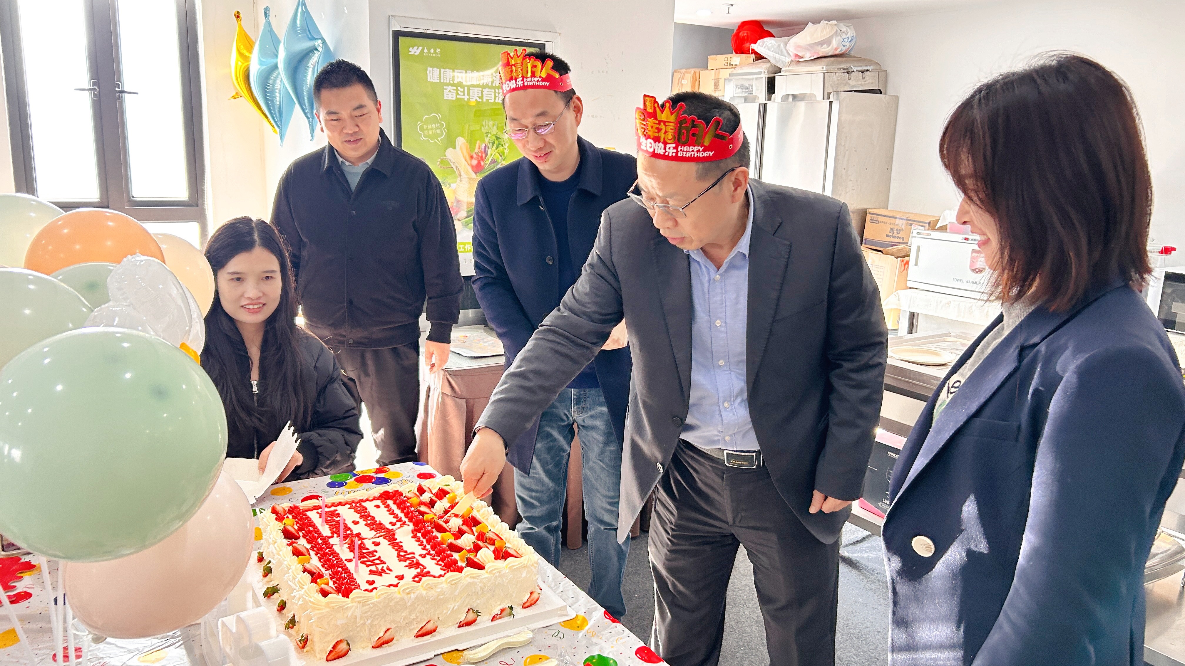 永业行董事长潘世炳、副总裁金建华到场祝贺,潘世炳向所有员工道一声感谢、向四季度生日的寿星们送一份祝福,与寿星代表一起分享蛋糕,祝全体员工及家人新的一年有期、有盼、无忧、无虑,心怀热爱,勇往直前,所愿皆圆。