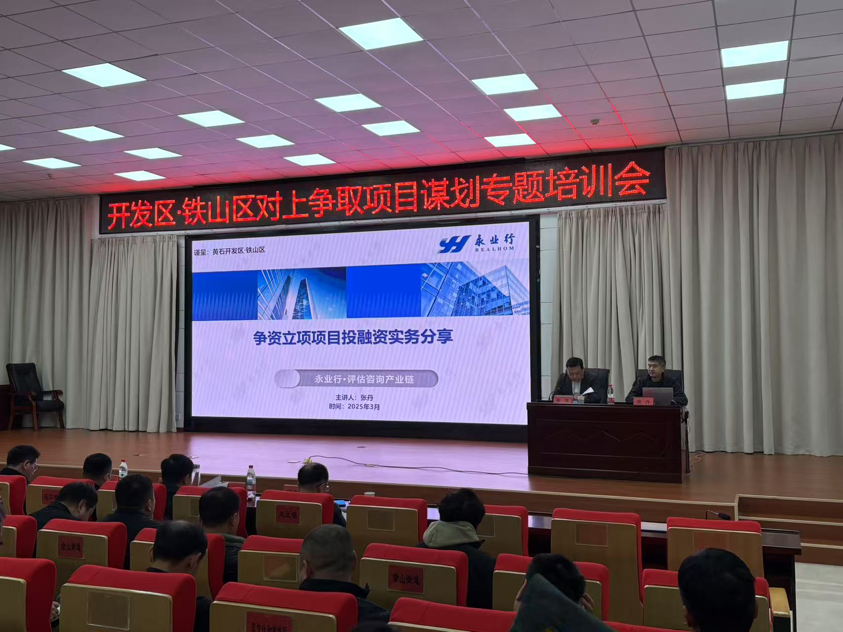 2025年3月14日,黄石经济技术开发区·铁山区举办对上争取项目谋划专题培训会,开发区党工委副书记、铁山区区长余文化出席会议,常务副区长龚晖主持并作总结讲话。永业行联席总裁王琴带领技术团队参加培训,财税评估咨询事业部技术中心总经理张丹应邀作“争资立项项目投融资实务分享”。
